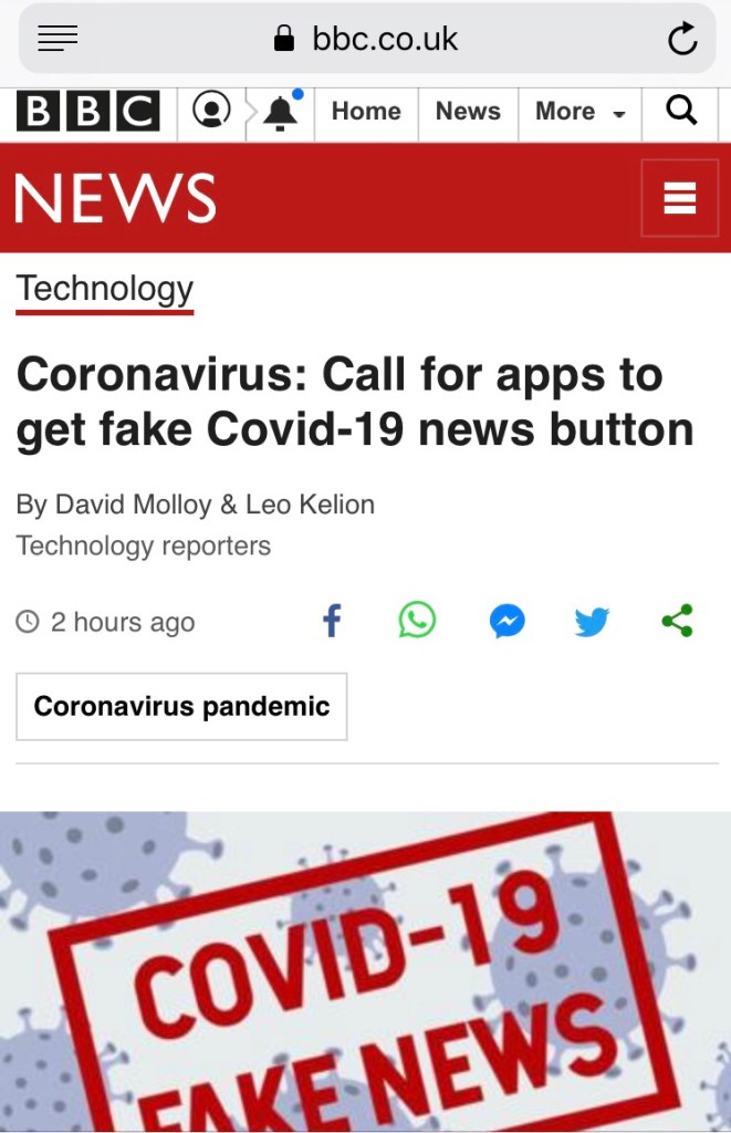 Apps ‘need dedicated fake coronavirus news button’. (2020). Retrieved 9 April 2020, from https://www.bbc.co.uk/news/technology-52157202?fbclid=IwAR1-xBbebZA3PdmeXaaWcmWKBFdXMtMHMRq-TPPxB50ga0XCCxOUUotd2mk